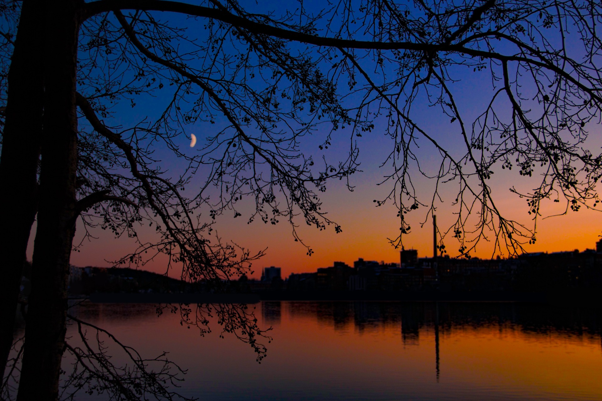 Vilken färgrik solnedgång i en skiftning av blått och orange som speglar sig i Södertälje kanals vatten. En halvmåne syns på himlavalvet. Bakom den vackra trädgrenen, på andra sidan vattnet, syns bl a bostadshus och den långa skorstenen hos Astra Zeneca.