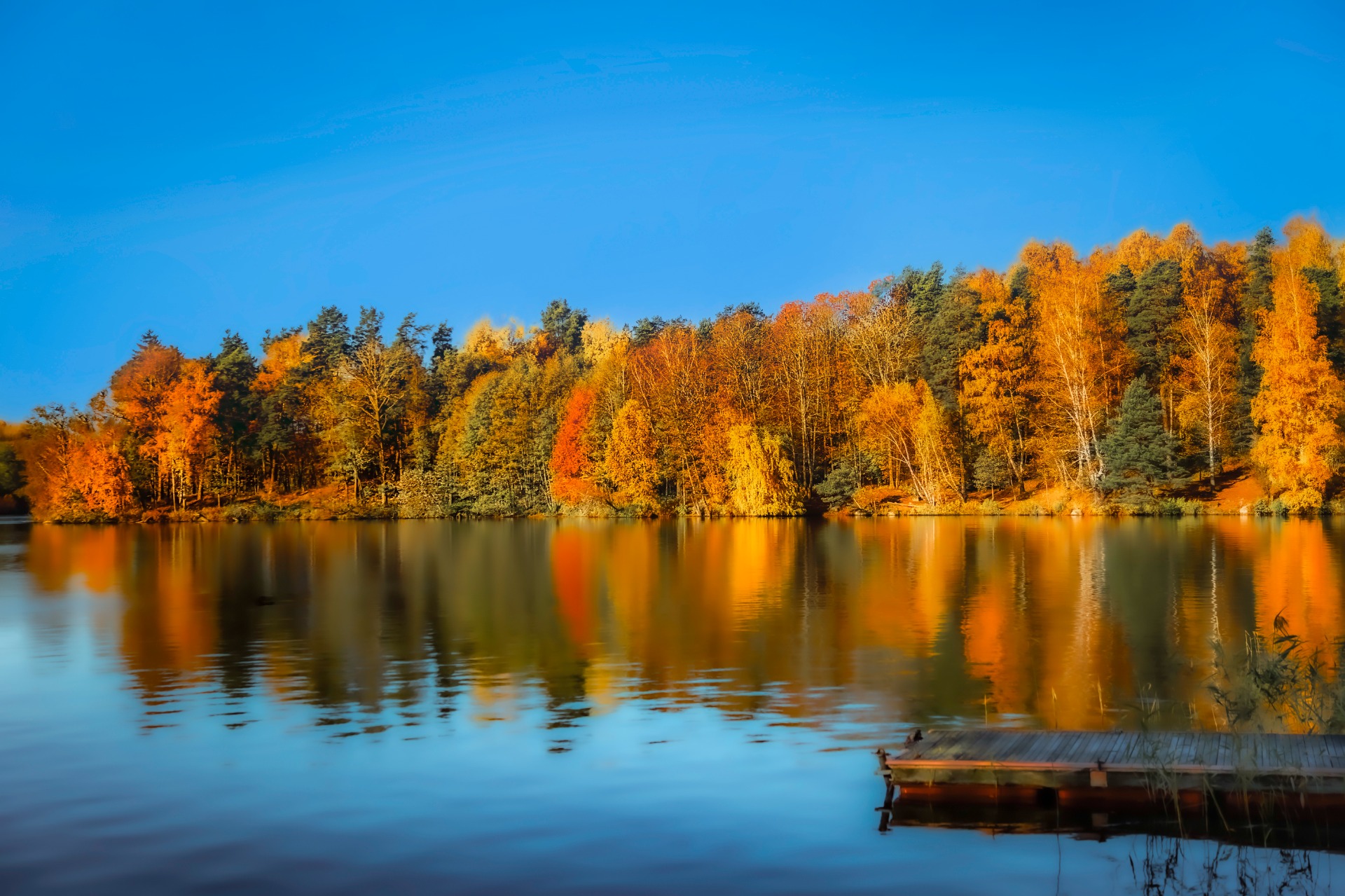 Höstbild med en brygga och vacker vattenspegling från Bergvik i Södertälje