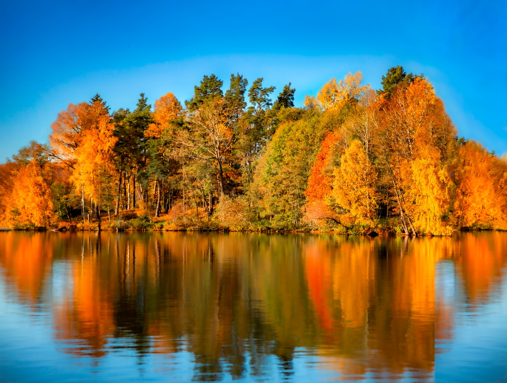 En färgsprakande höstdag i Bergvik i Södertälje med höstträd som speglar sig i vattnet.